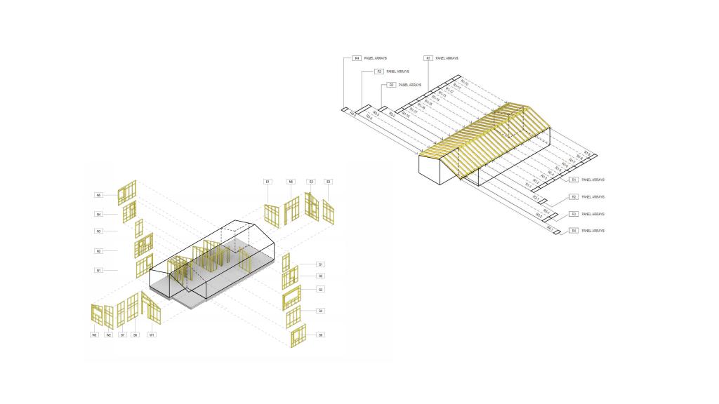 The team panelized the walls and the roof of the house, meaning that sections were built in units that will be tied together in the field during assembly. The studio used a comprehensive computer model of the house to design and manage the prefabrication process, and then built the panels at APDesign’s off-campus fabrication facility. By the end of the summer of 2019, the studio completed the house’s 24 wall panels and 26 roof panels, along with modular plywood casework that will function throughout the interior of the home.