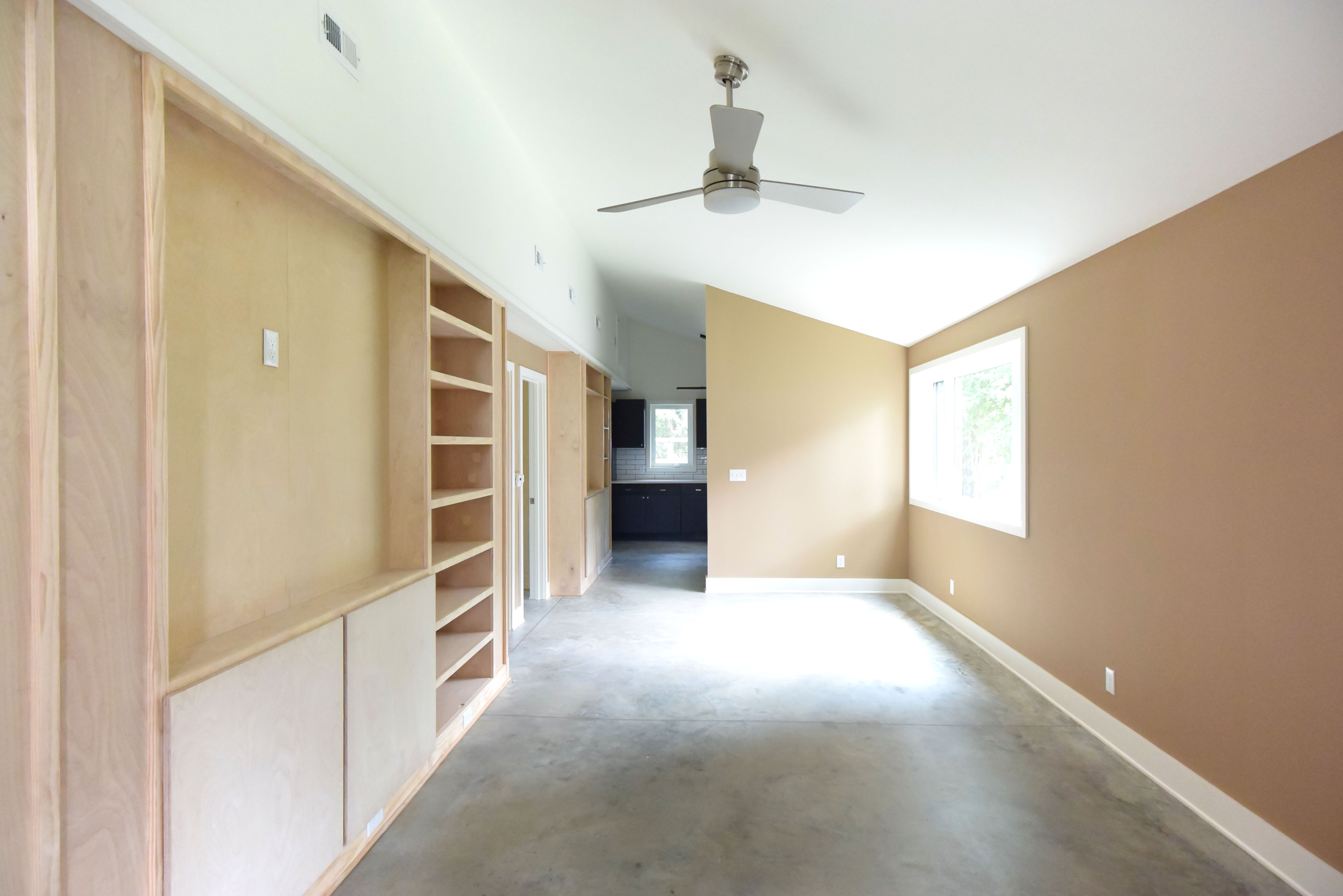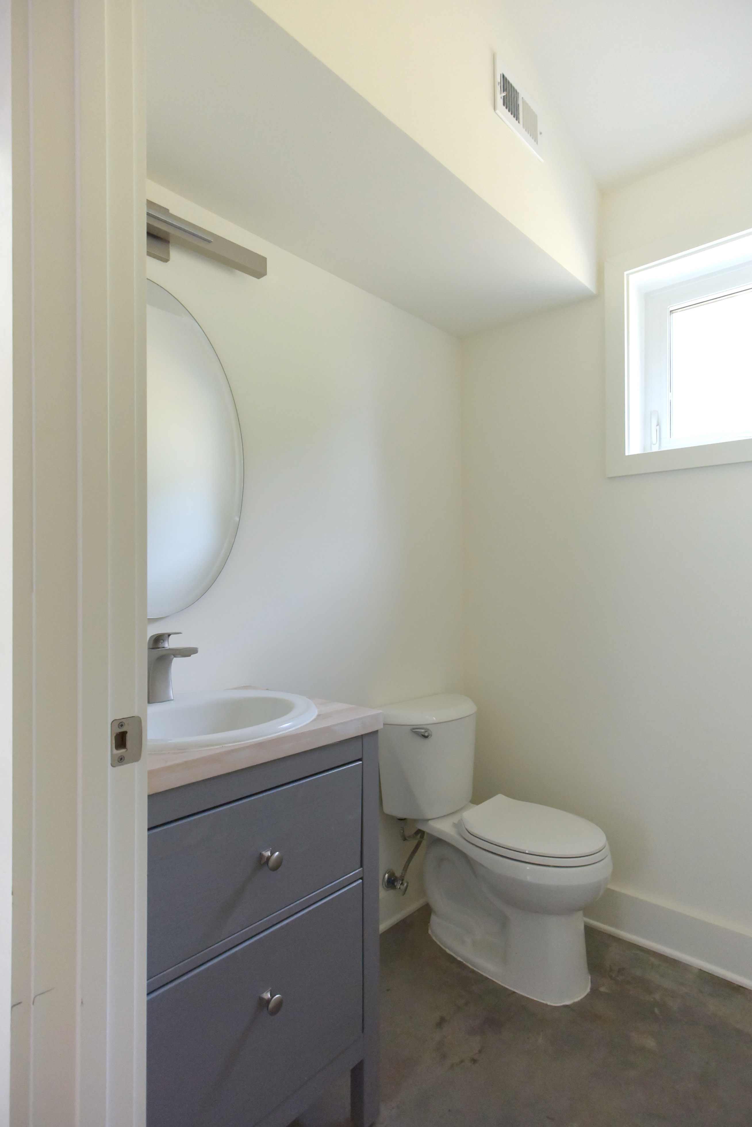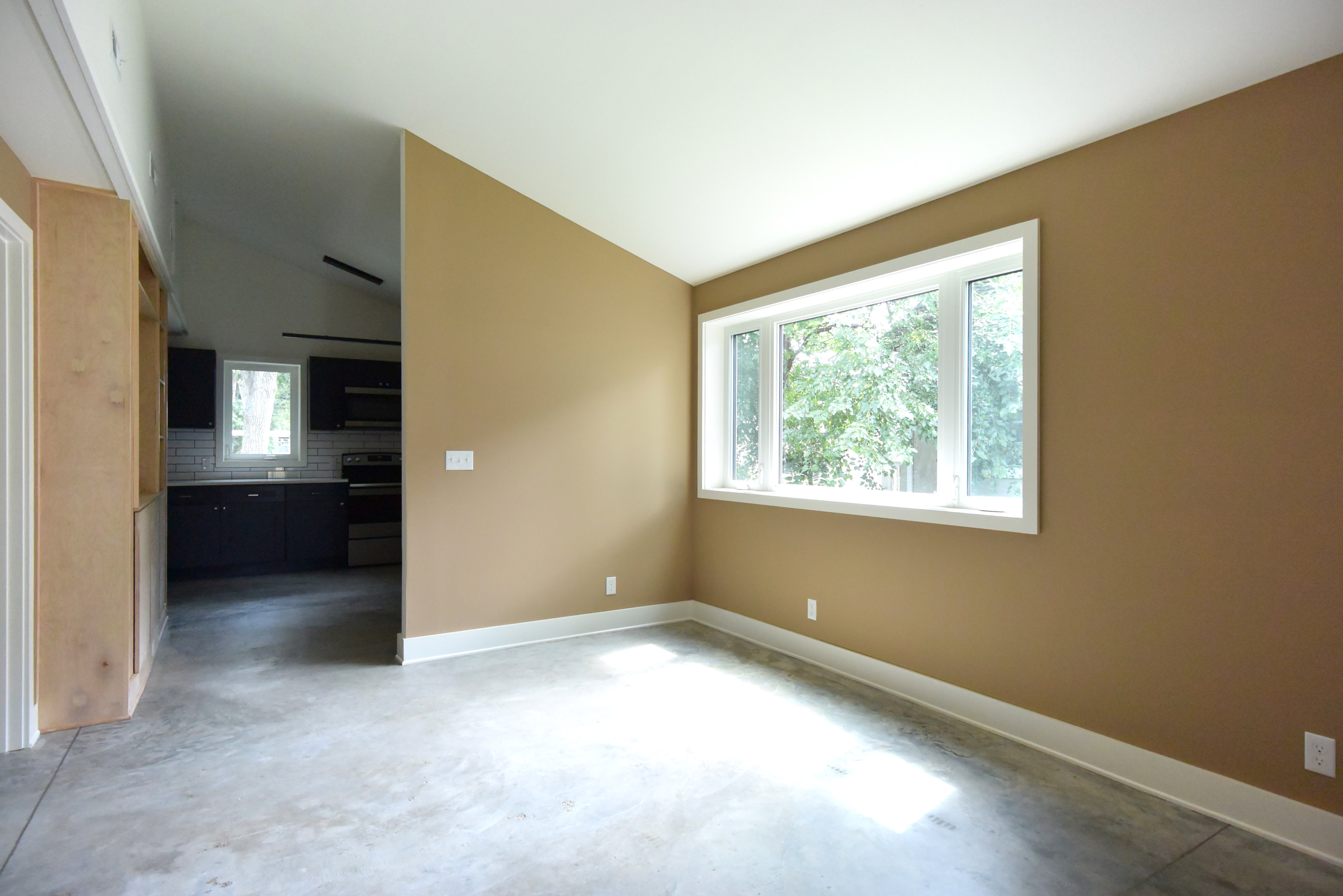 Design. The studio set out to develop a house design that was right-sized, durable, and functional, taking inspiration from the efficient but livable housing from the neighborhood’s past. After presenting several schemes to Mattie Rhodes and community stakeholders, the group selected a final design. The 1033 sq. ft. home intended to demonstrate a thoughtfully-designed, healthy, energy efficient, and affordable home that can help a household to thrive — while investing in their neighborhood and strengthening their community in the long term. The design originated from simple residential forms already abundant in the neighborhood. The house is split between private and public areas, which are shifted to optimize circulation alignment and reduce unnecessary floor area. The home’s roof can be used for electricity-generating PVs in the future, while extra space on the parcel will be available for gardening, gathering, and recreation.