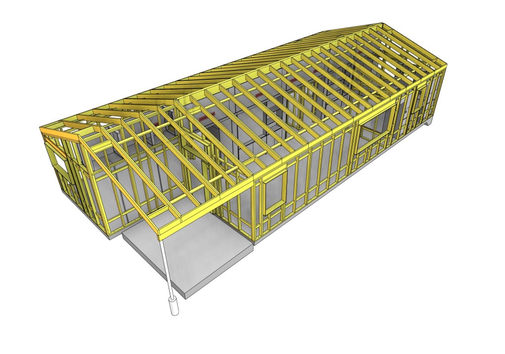 Prefab. During the spring of 2019, the studio completed construction drawings for the project and developed an overall strategy to prefabricate the house in panels, designing its many connections and ensuring compatibility with building code. Panelized construction allowed the home to be built off-site, minimizing waste, allowing insulation to be installed in the shop, and speeding up construction time.