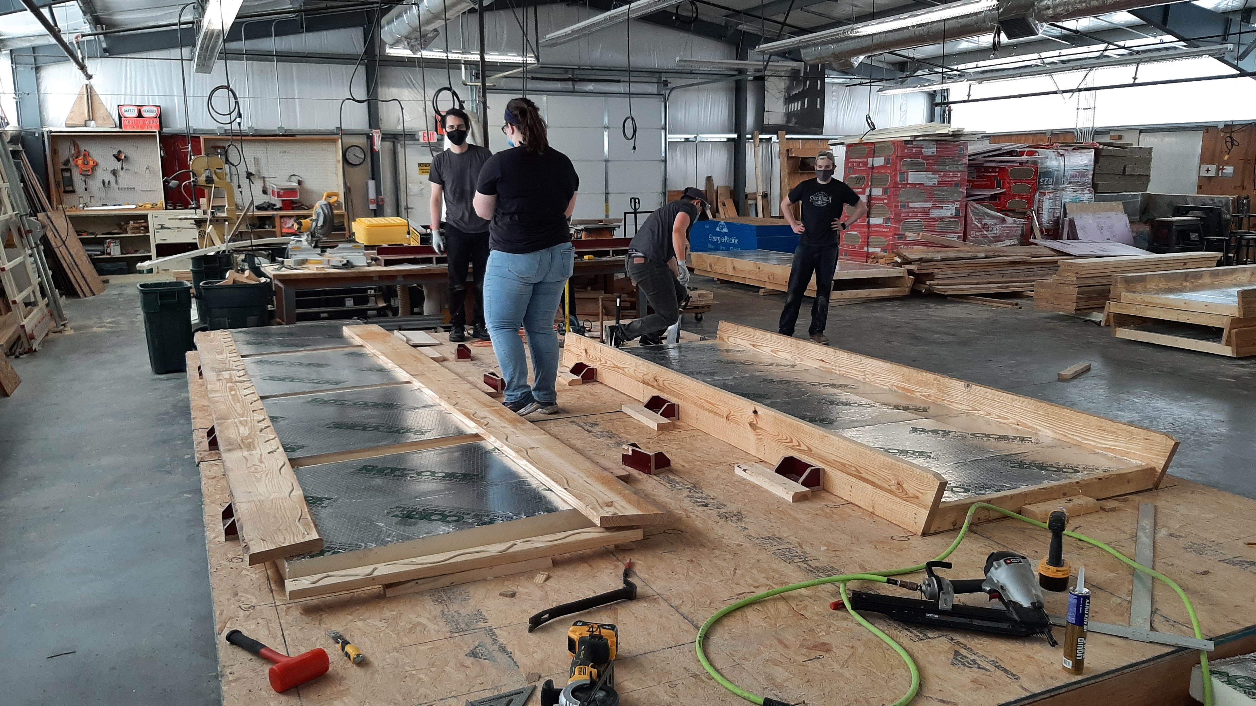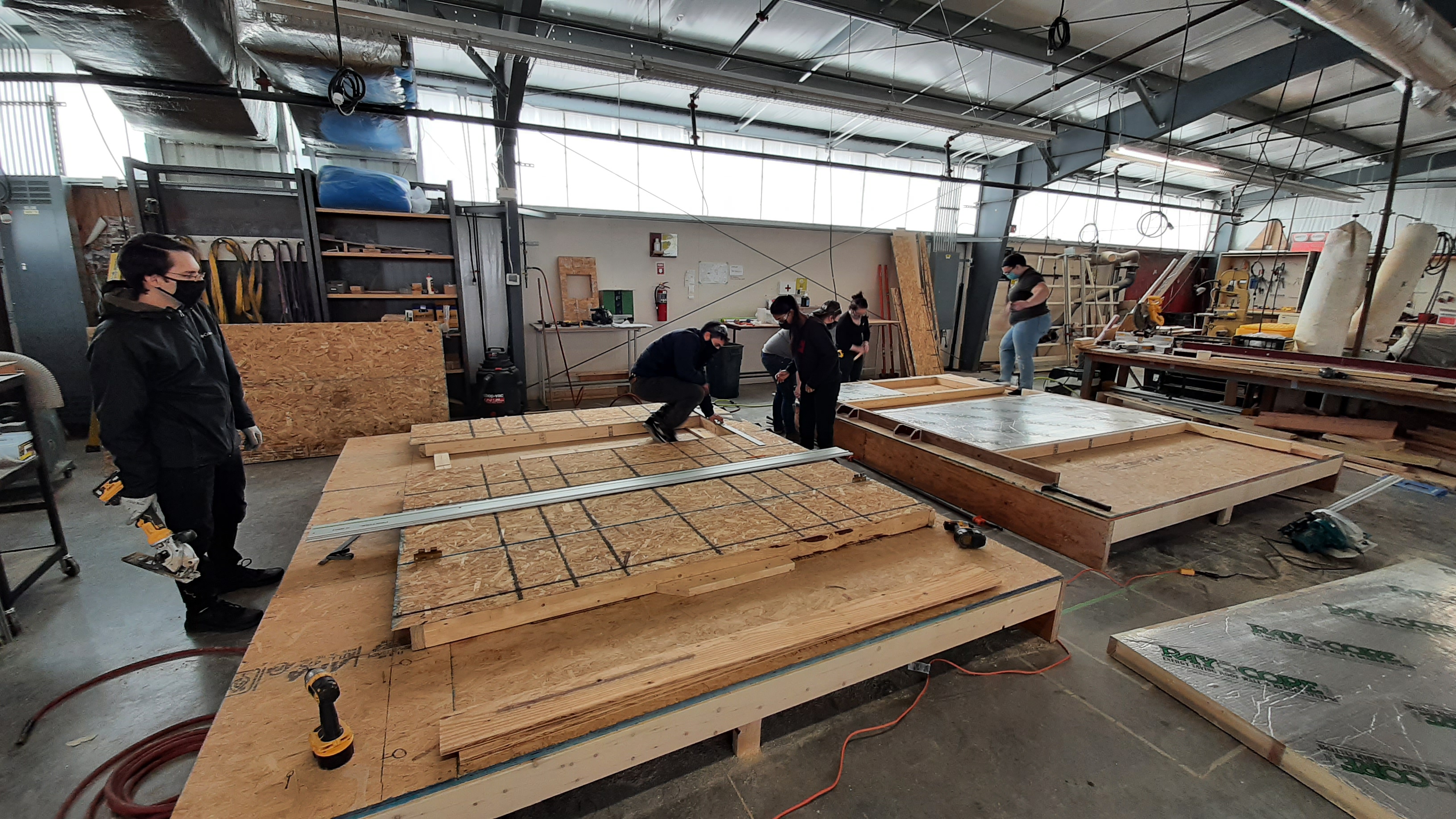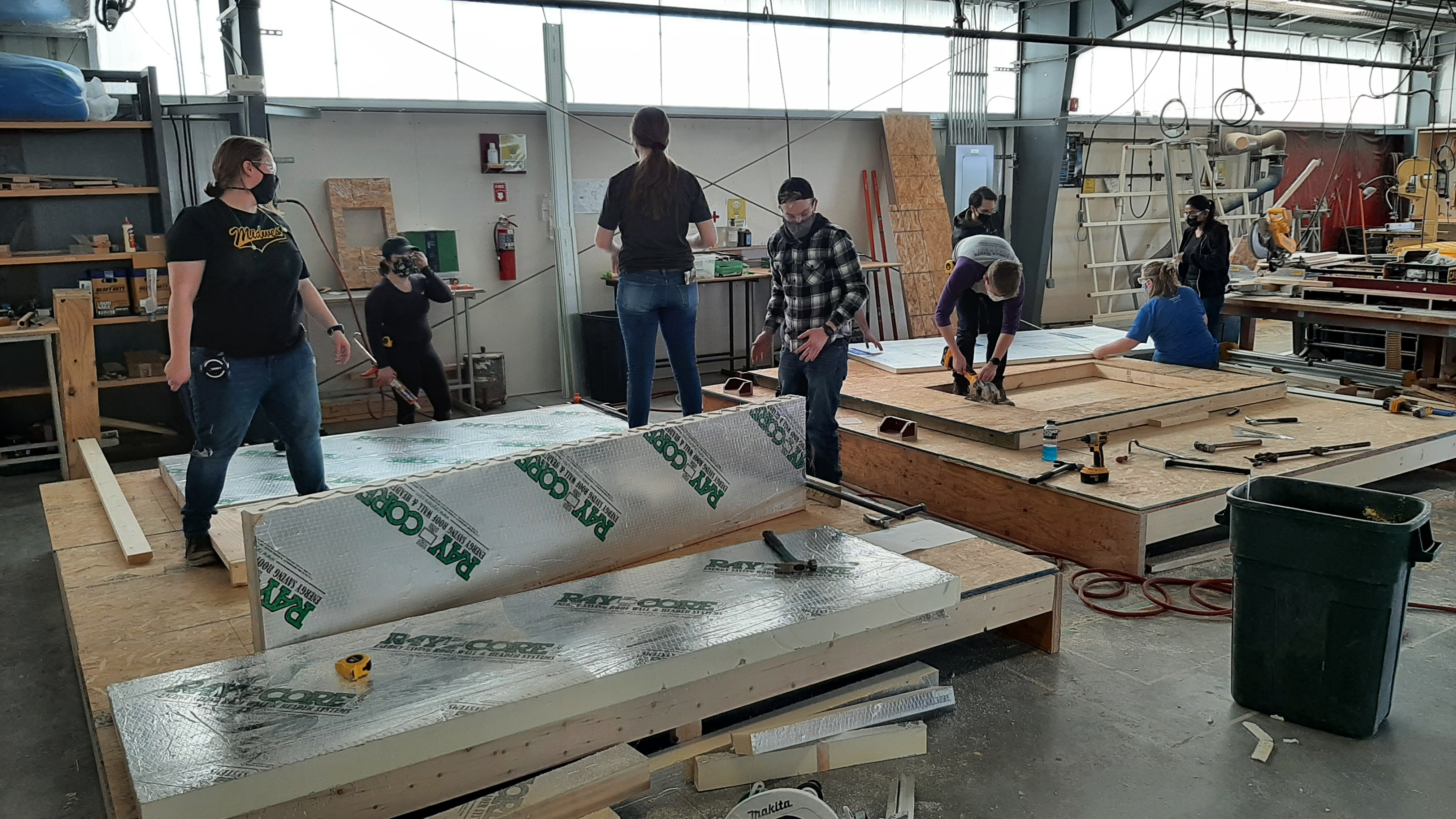 Students developed CDs and prefab shop drawings in early spring of 2021 and completed the prefab panels in less than two weeks in the shop. On site assembly of the home’s shell took one week, and was completed in the final week of the spring 2021 semester. Students and faculty from three different programs — the Net Positive Studio, Fort Riley’s Home Builder’s Institute, and Manhattan Area Technical College — worked on site in a mixed crew.