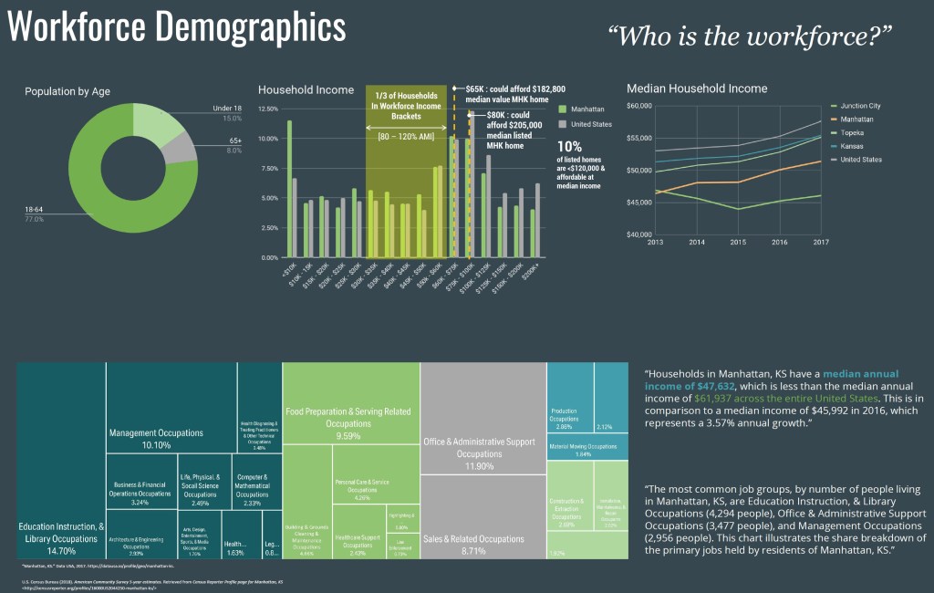 Process. The studio researched the workforce profile in Ogden and Manhattan, using a housing market snapshot to present the breadth and characteristics of local housing affordability issues. Students developed conceptual design and SD schemes individual during the fall, which they presented to project stakeholders along with detailed site analysis for the two sites. The studio met with a local financial counselor to better understand barriers and pathways to homeownership, and interviewed trainees in the WSHP’s workforce development programs to learn more about their individual needs and goals for housing.