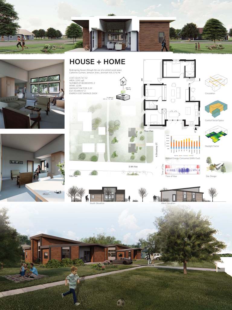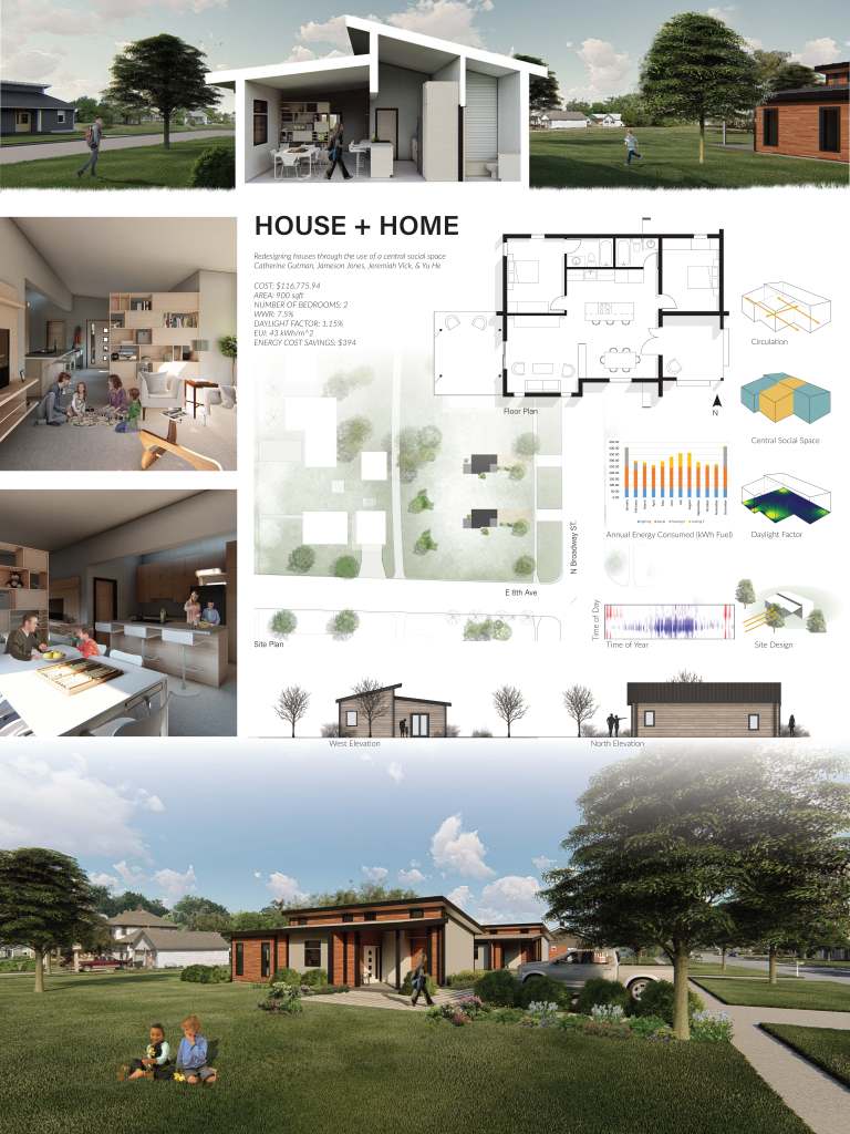 In the 3-bedroom scheme, the team wanted to create an architecturally unique space that allowed for the bedrooms to be somewhat separate but still connected by the central social space. This made the space feel larger than it was and brought in more natural light due to its elongated plan. This home was the central idea of the central social space and is the most ideal for open communication and privacy. This home provided an interesting architectural plan and façade adding value for a lower cost home. Our price calculations showed a possible option for a more architecturally unique design with a slightly larger cost, but still within reach.